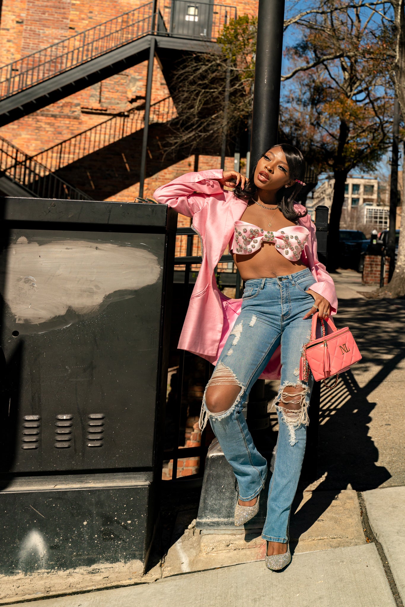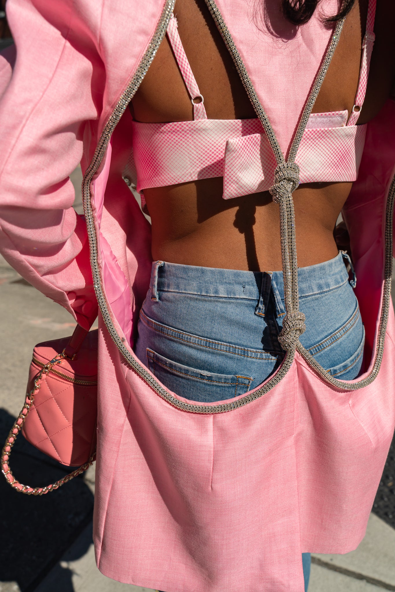 Pink single breast blazer with cut-out back and rhinestone knot detailing